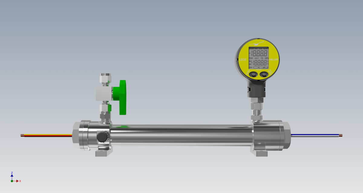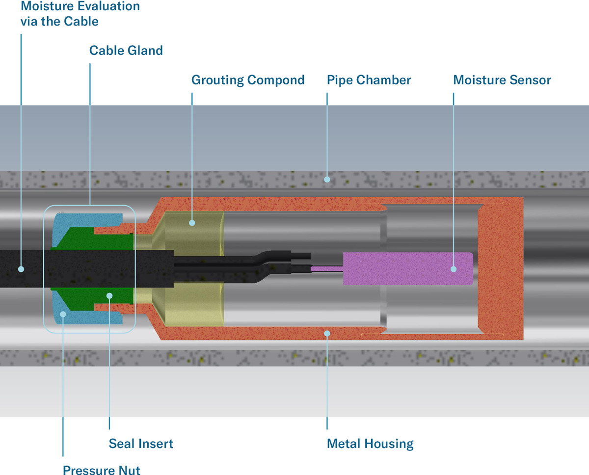 A specially prepared level probe is manufactured for this purpose. Instead of the usual electronics for pressure evaluation, it contains a moisture sensor inside. The level probe is enclosed in a pipe chamber with a pressure connection and pressure gauge. The electrical output of the prepared level probe is led out of the chamber via the cable. In this way, the moisture can be determined.